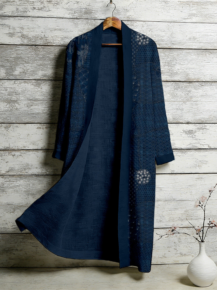 Vintage Japanese Sashiko Art Flowy Linen Long Kimono