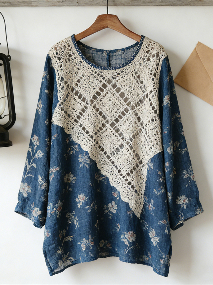 Vintage Lace Patchwork Floral Linen Women's Long Sleeve Shirt