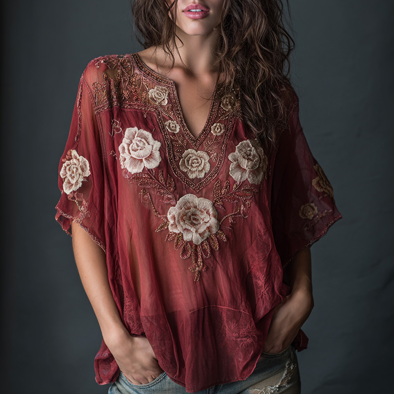 Women's Bohe Floral Embroidered Art Print Flowy Linen Blend Casual Short Sleeve Tops