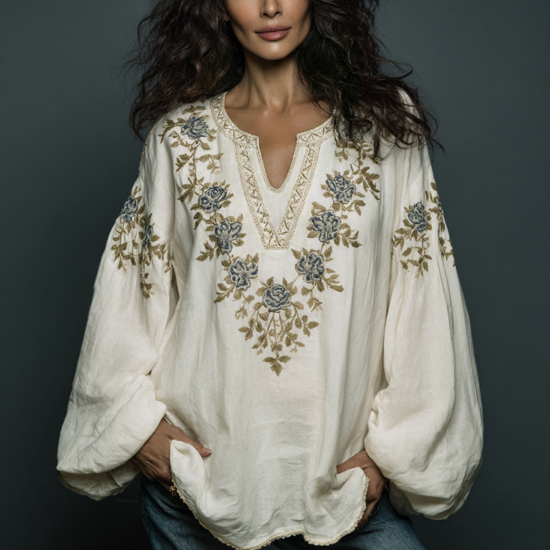Women's Bohe Floral Embroidered Art Print Flowy Linen Blend Casual Tunic