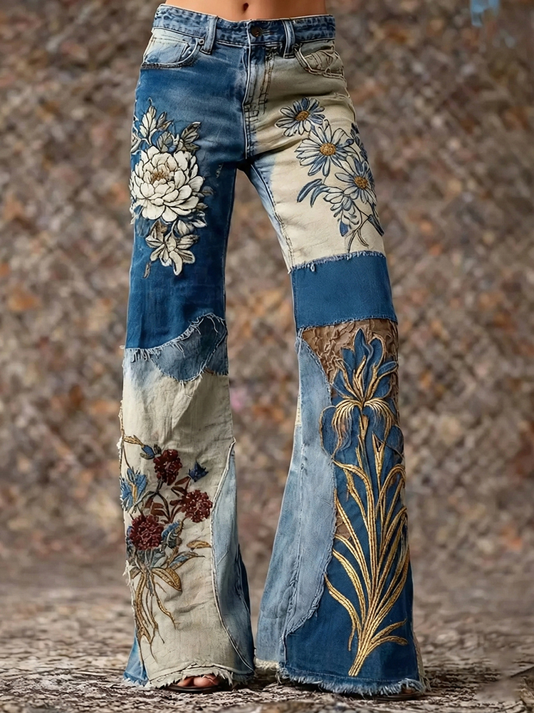 Women's Bohemian Style Floral Patchwork Art Jeans