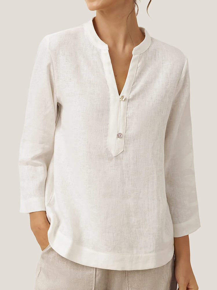 Women's Casual Solid Color Linen V-neck Pullover With Button Top