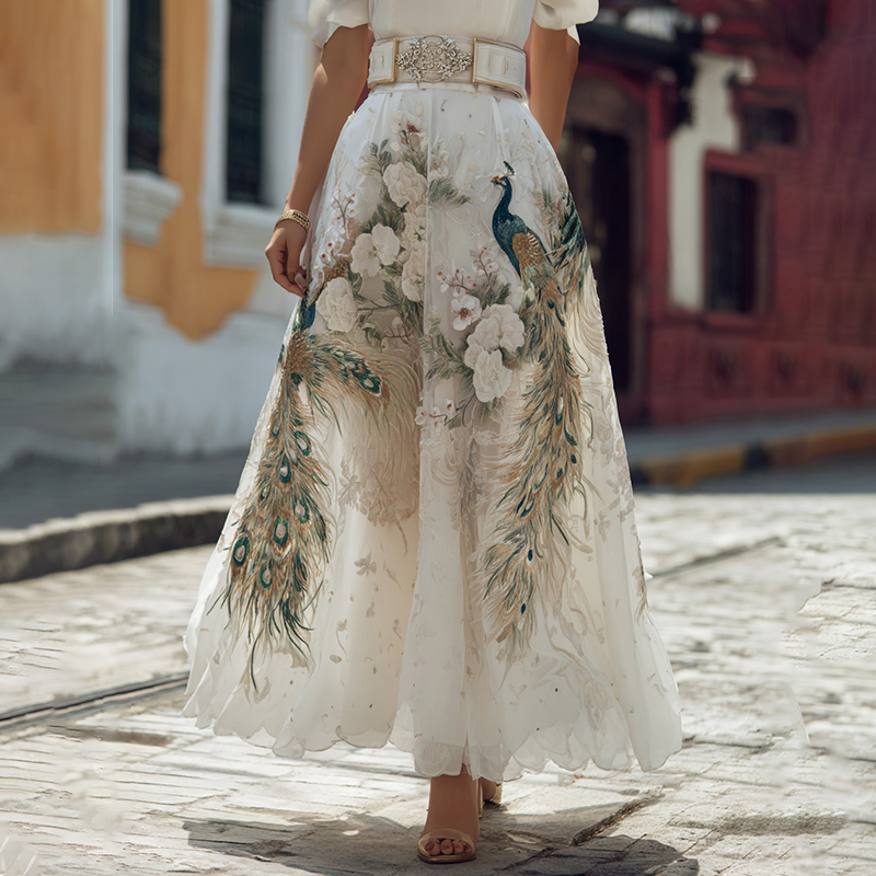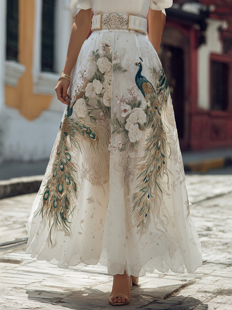 Women's Elegant Floral With Peacock Art Linen Blend Casual Maxii Skirt
