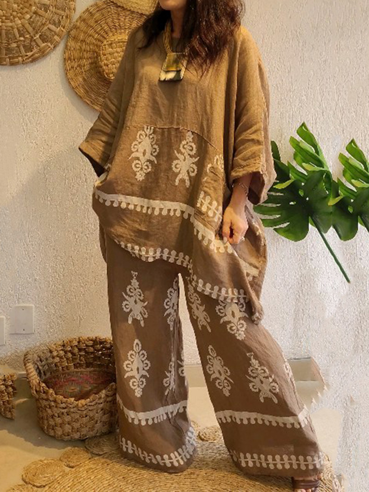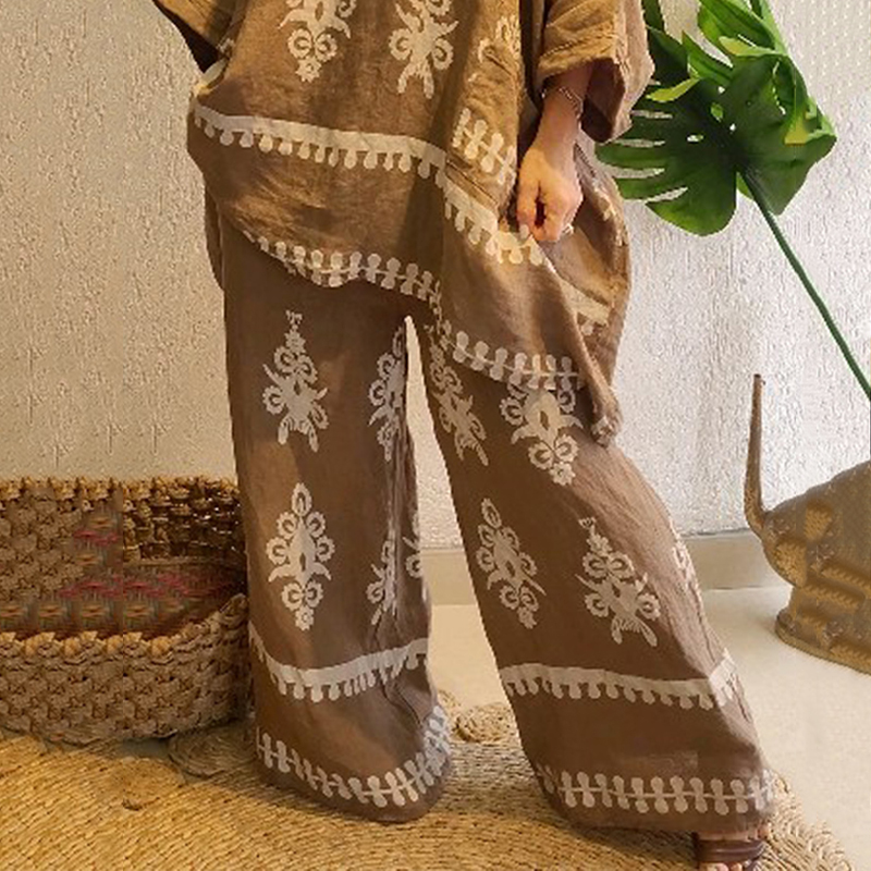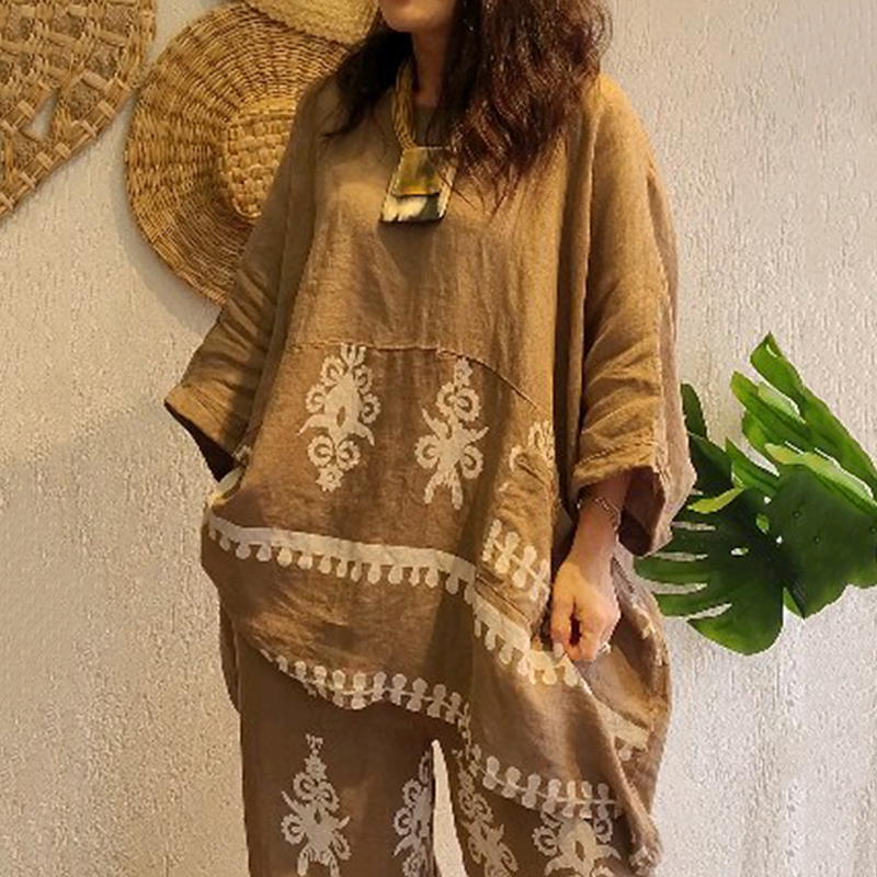Women's Fashion Ethnic Floral Linen Long Sleeve Pants Two-piece Set