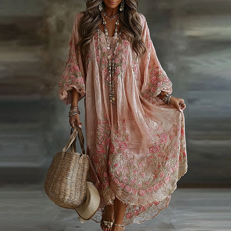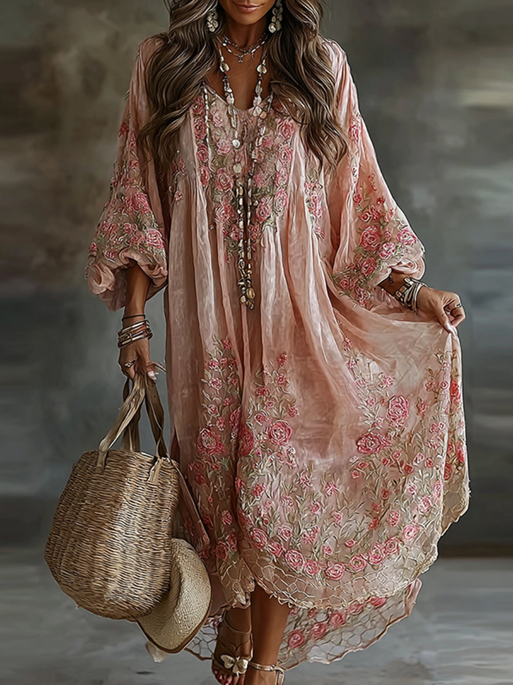 Women's Floral Art Flowy Linen Blend Casual Long Sleeve Maxi Dress
