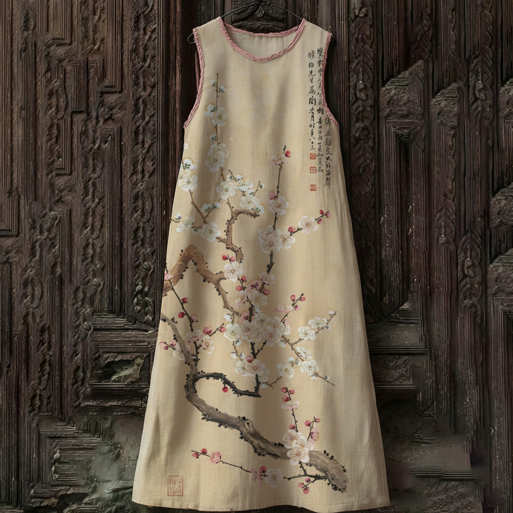 Women's Floral Blossom Art Print Flowy Linen Blend Casual Sleeveless Midi Dress