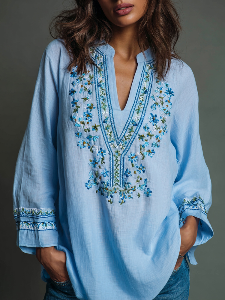 Women's Floral Embroidered Art Print Flowy Linen Blend Casual Tunic