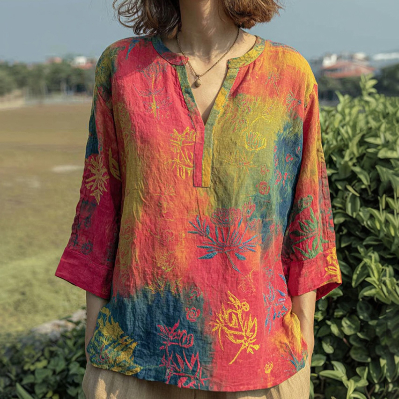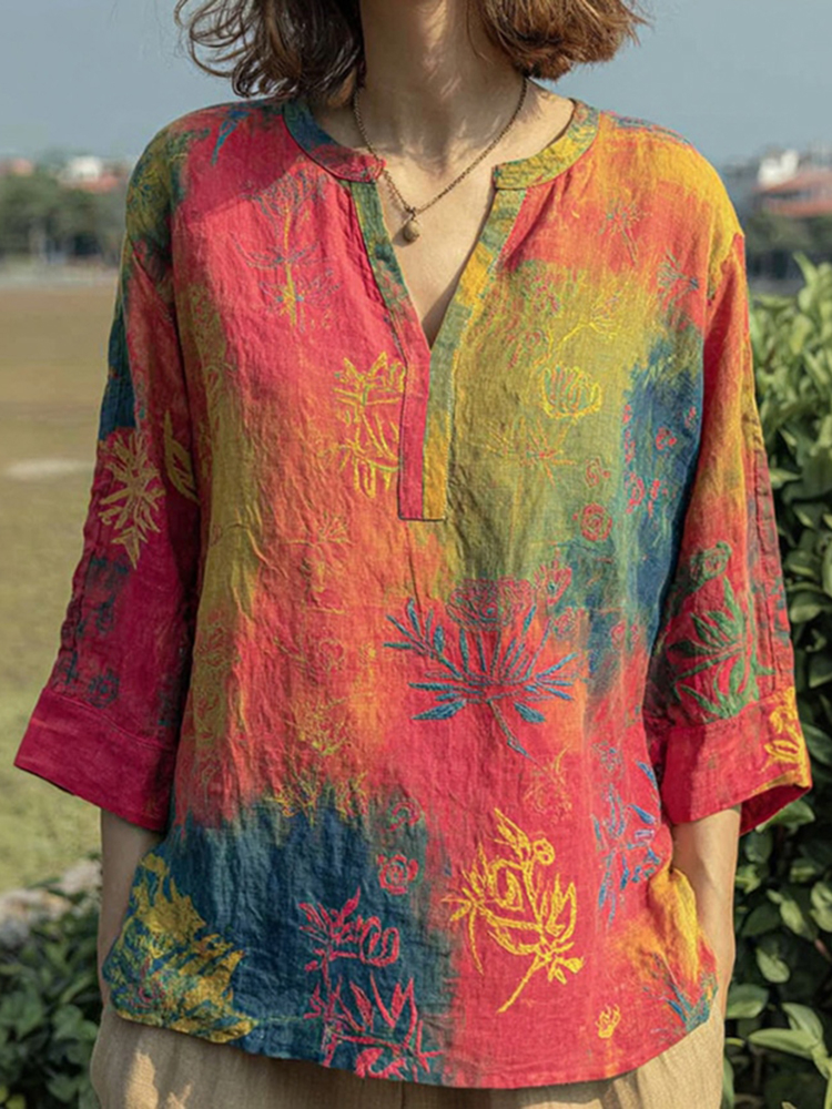 Women's Floral Pattern Tie-dye Art V-neck T-shirt