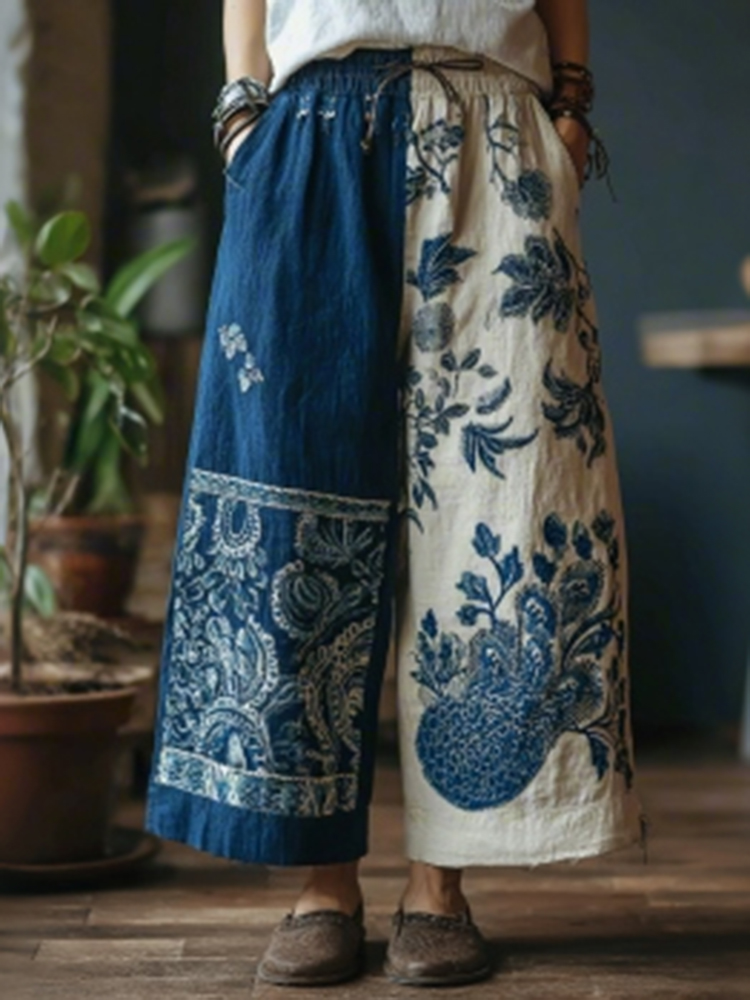 Women's Japanese Floral Art Patchwork Casual Pants