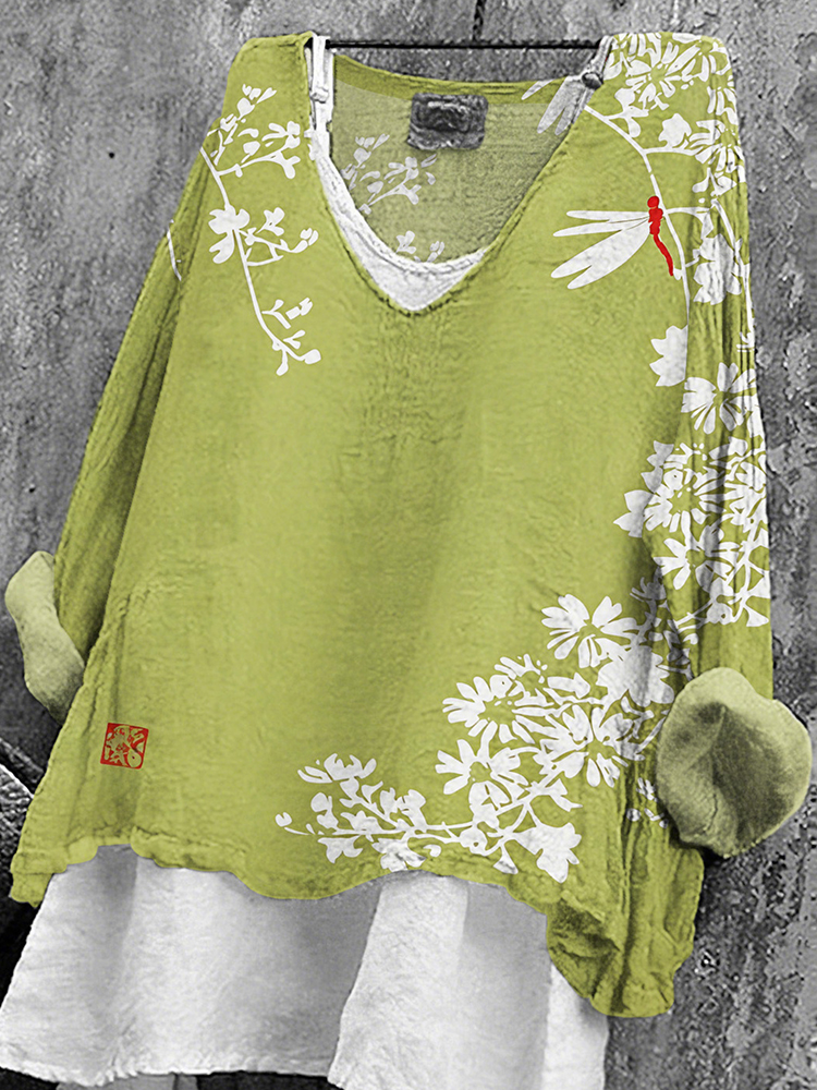 Women's Japanese Floral Art Print V-neck T-shirt