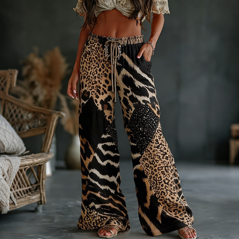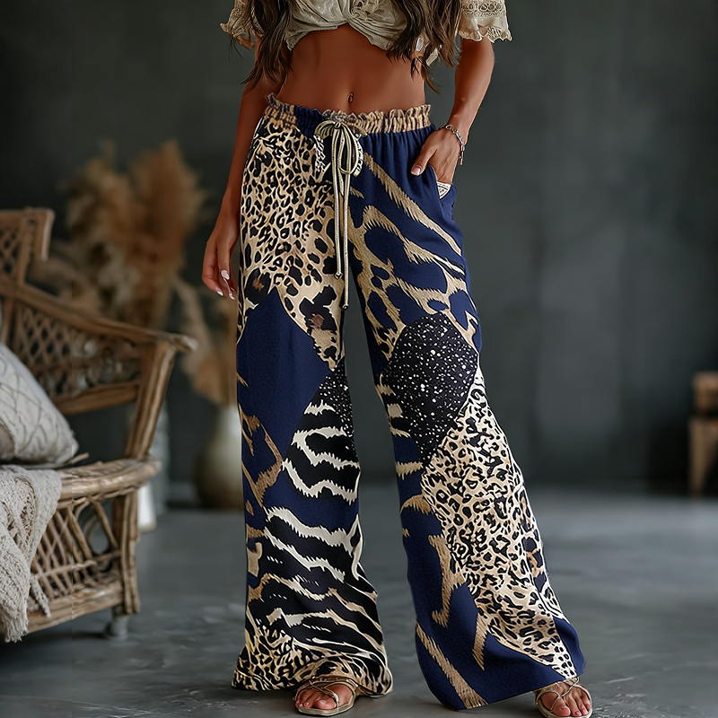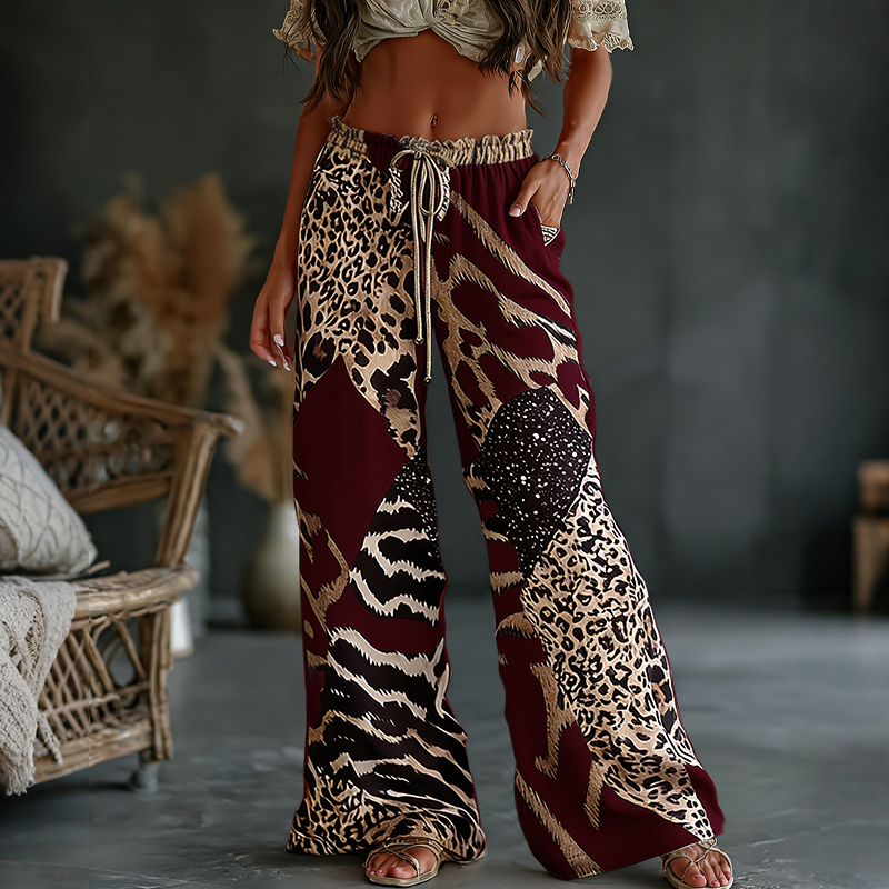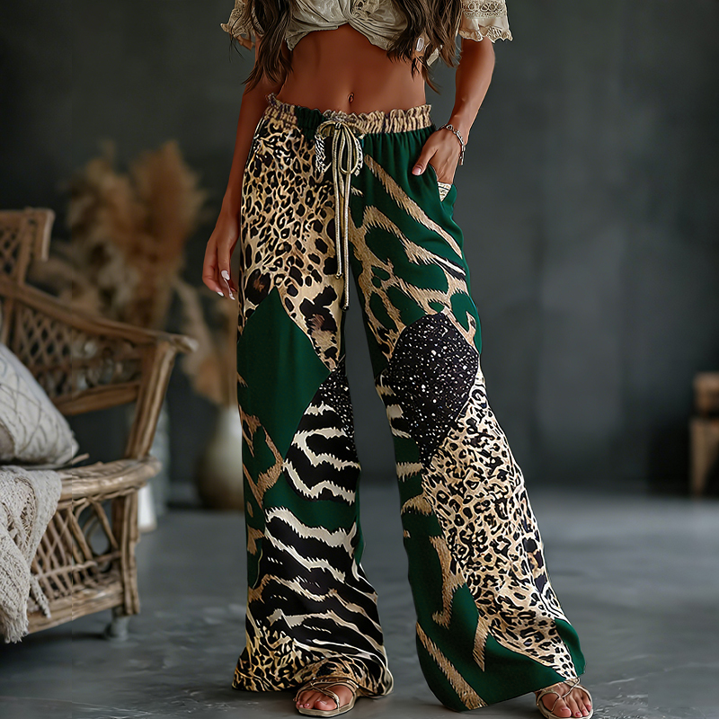 Women's Leopard And Animal Patchwork Art Print Flowy Linen Blend Casual Pants
