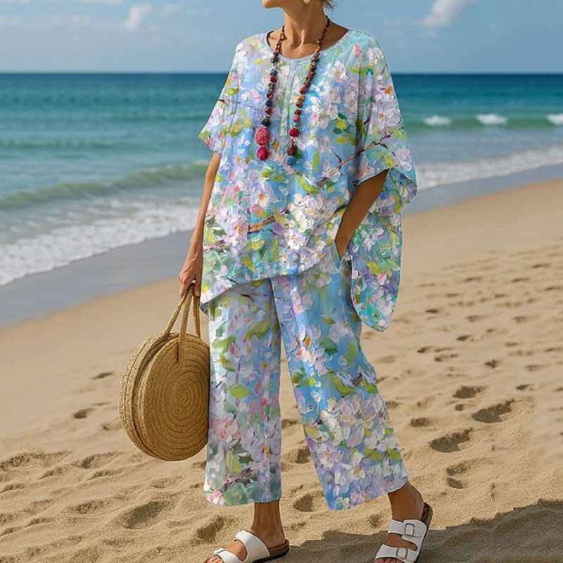 Women's Oil Painting Flowers Print T-shirt And Pants Two Piece Set