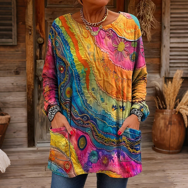 Women's Peace Tie-dye Rainbow Art Pattern Casual Long-sleeve Pocket T-shirt