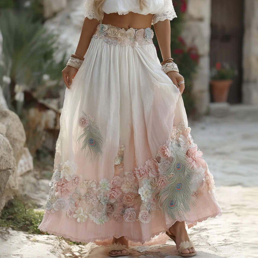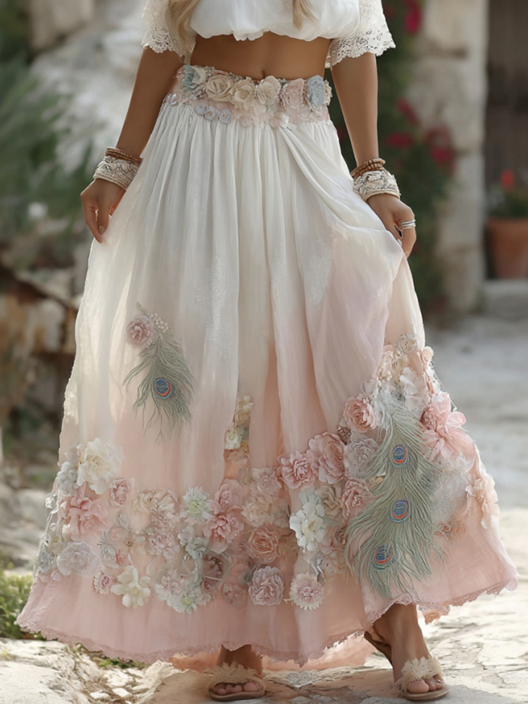 Women's Retro Elegant Peacock Feather Floral Linen Blend Casual Midi Skirt
