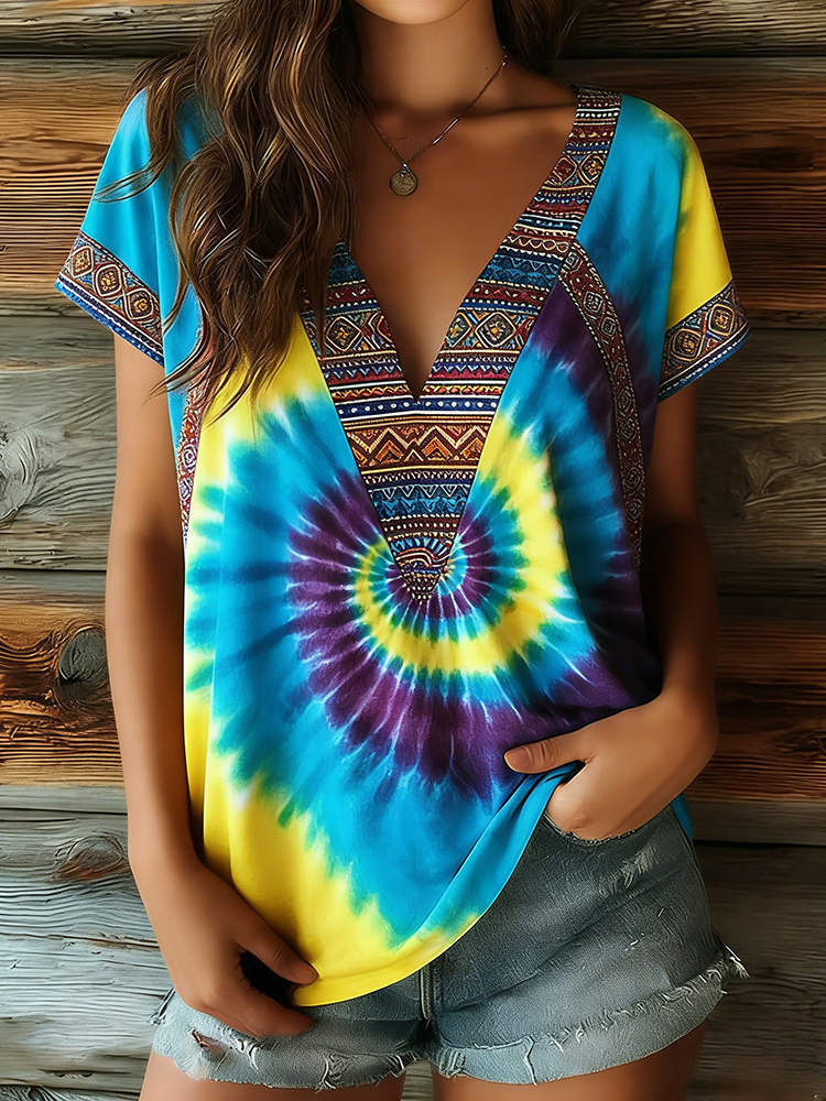 Women's Retro Ethnic Tie-dye Pattern V-neck T-shirt