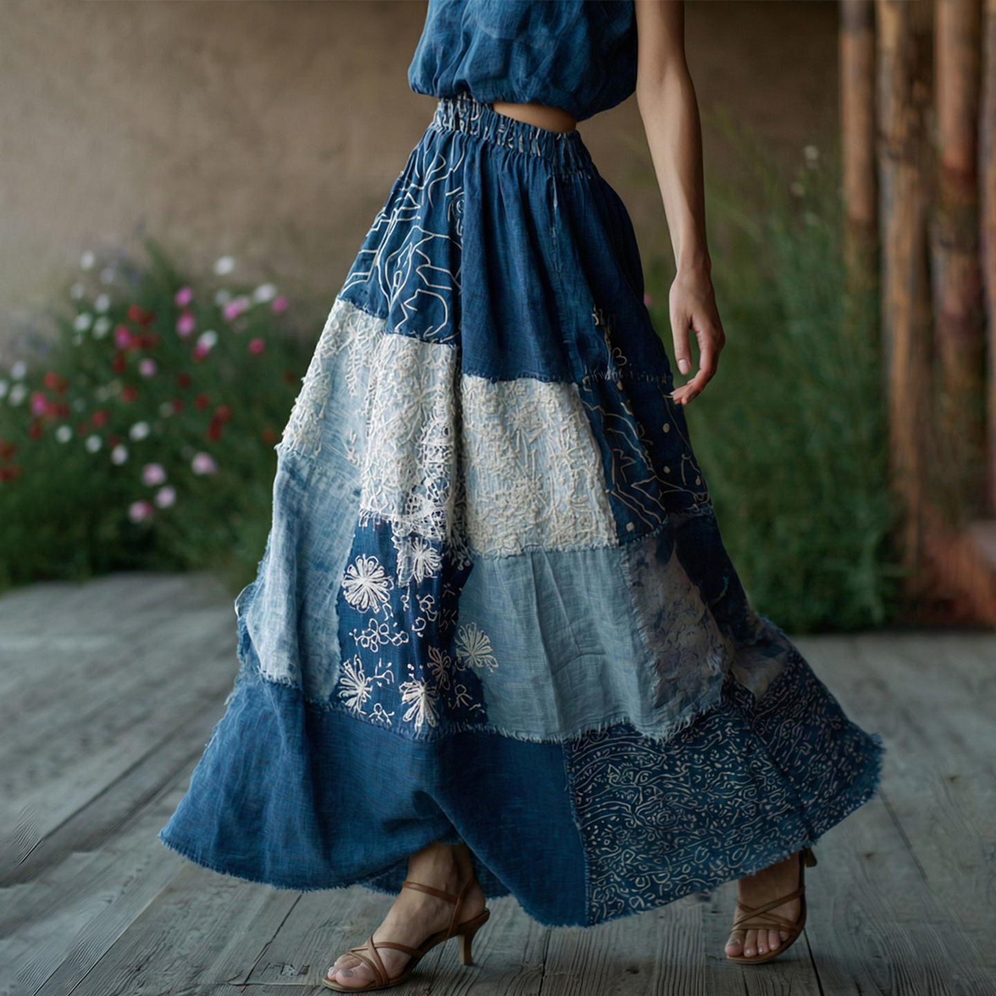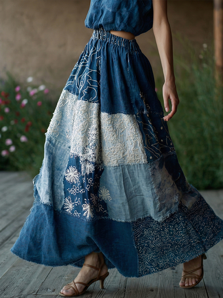 Women's Retro Floral Lace Embroidery Patchwork Art Linen Blend Casual Midi Skirt