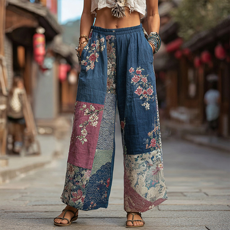 Women's Retro Japanese Floral Wave Patchwork Linen Pants