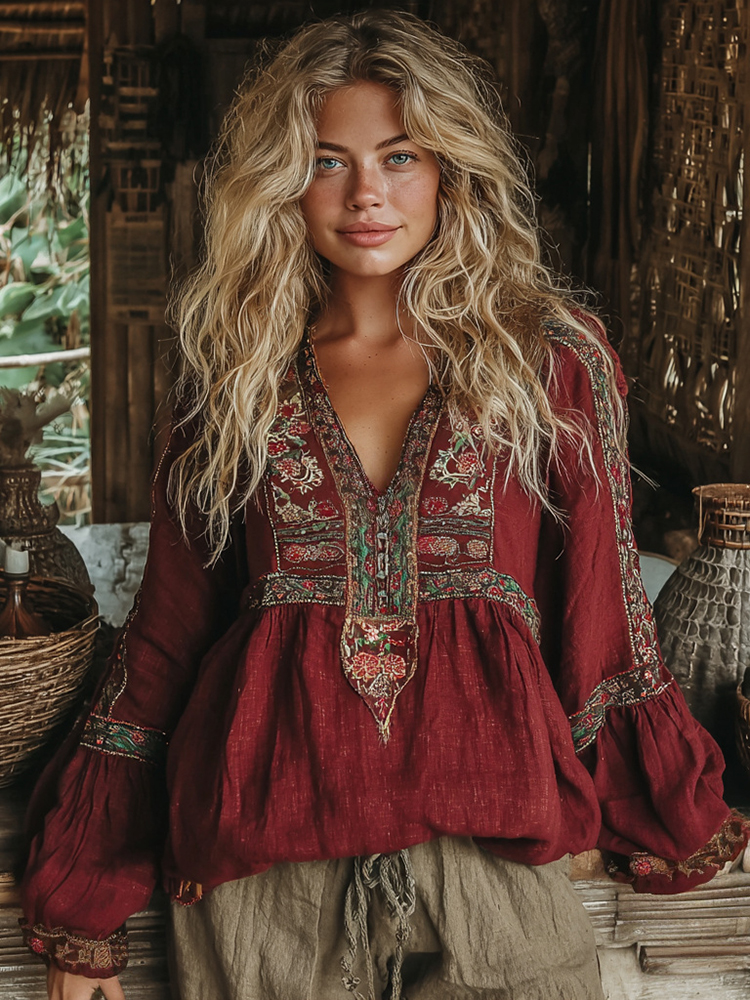Women's Vacation Boho Tribal Ethnic With Floral Patterns Print V-neck Linen Blend Tops