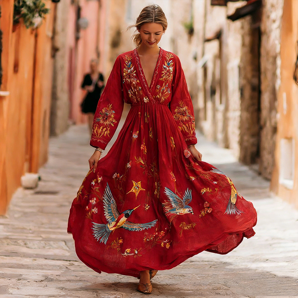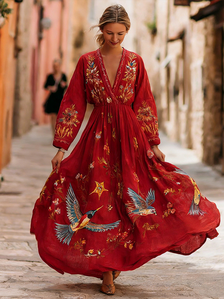 Women's Vintage Ethnic Floral And Bird Art Pattern Casual Dress