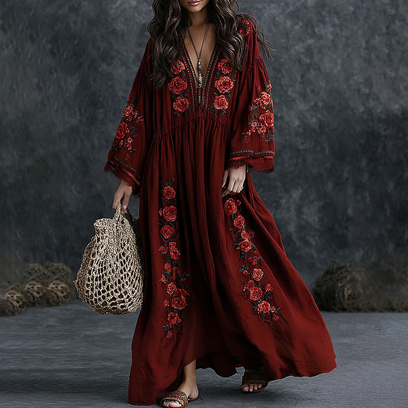 Women's Vintage Floral Art Print Flowy Linen Blend Casual Long Sleeve Maxi Dress