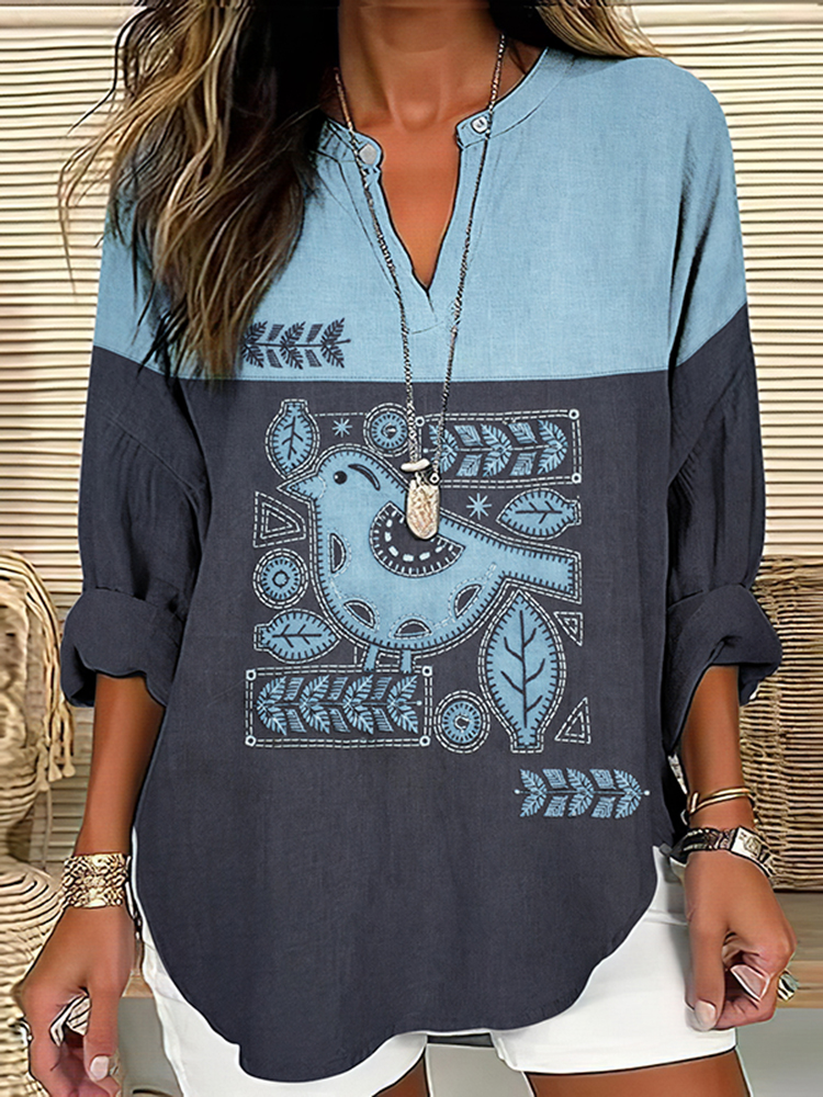 Women's Vintage Floral Bird Art Linen Long-sleeved Shirt