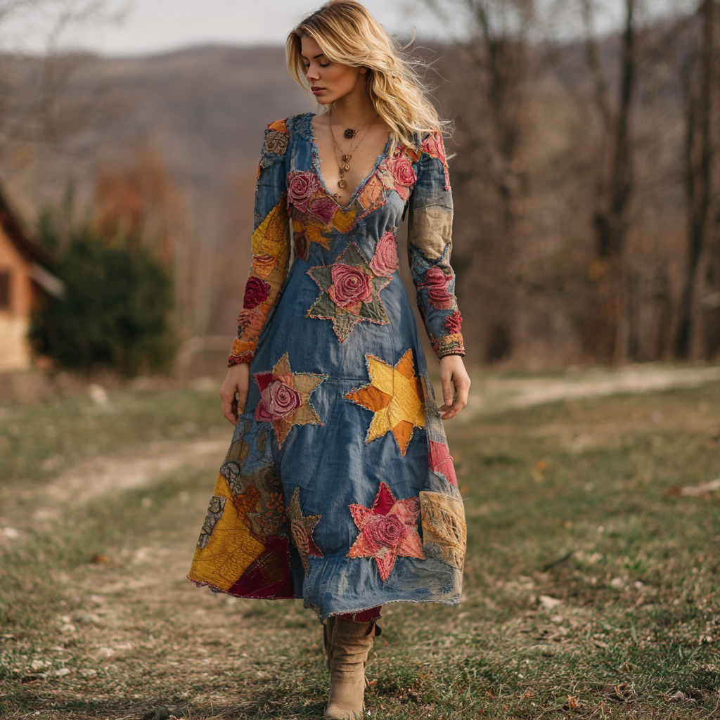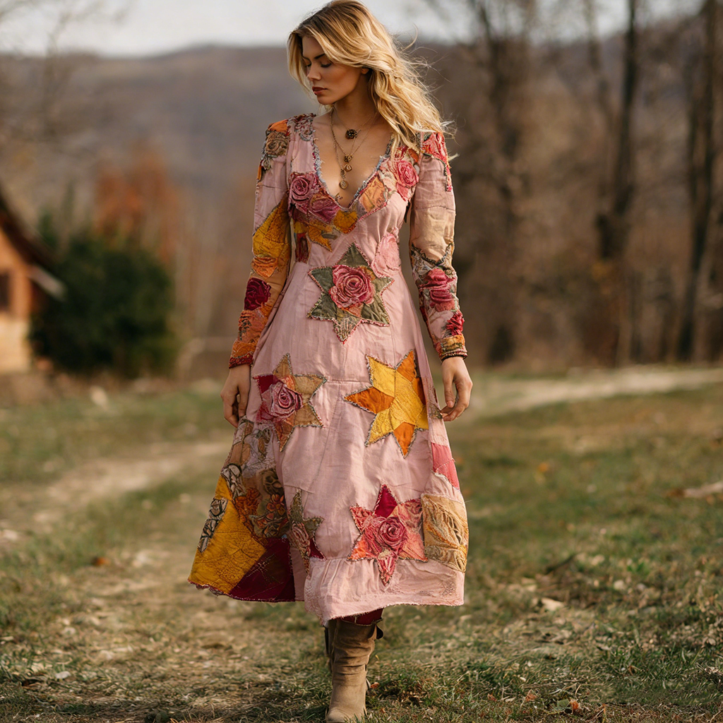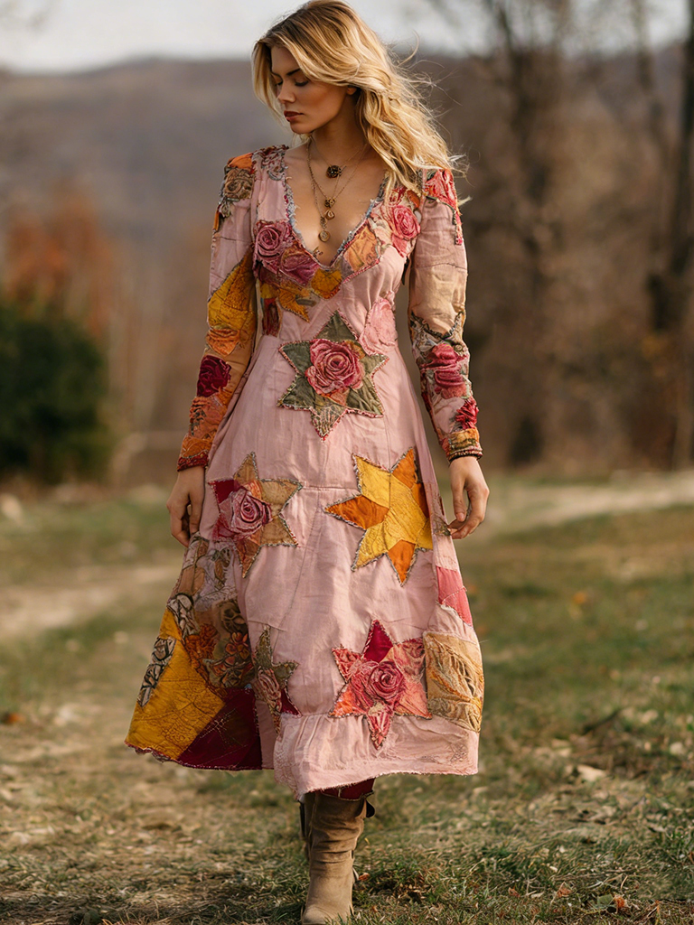 Women's Vintage Geometric Rose Patch Design V-neck Dress