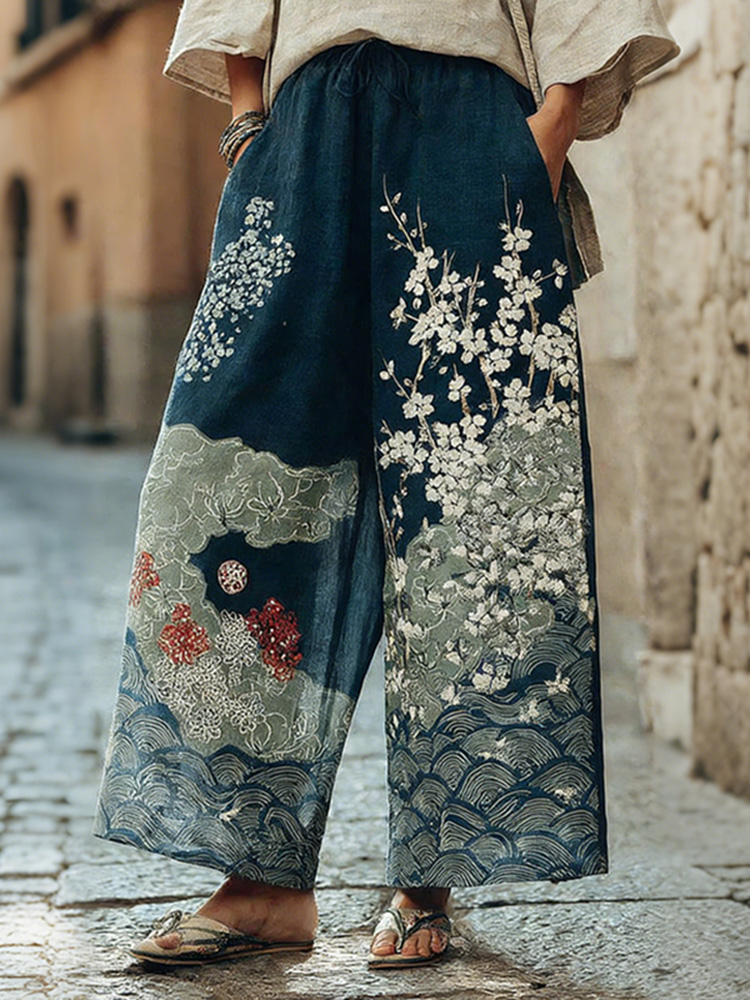 Women's Vintage Japanese Cherry Blossom And Wave Art Print Pants