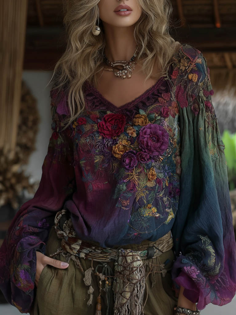 Women's Vintage Vacation Boho Floral Print V-neck Linen Blend Long Sleeve Tops