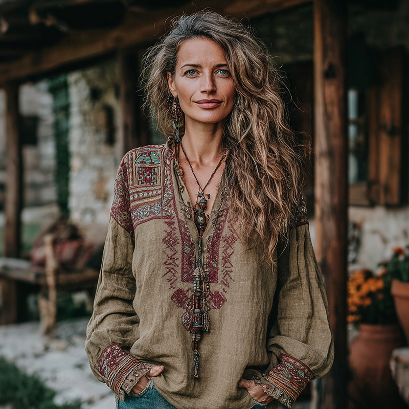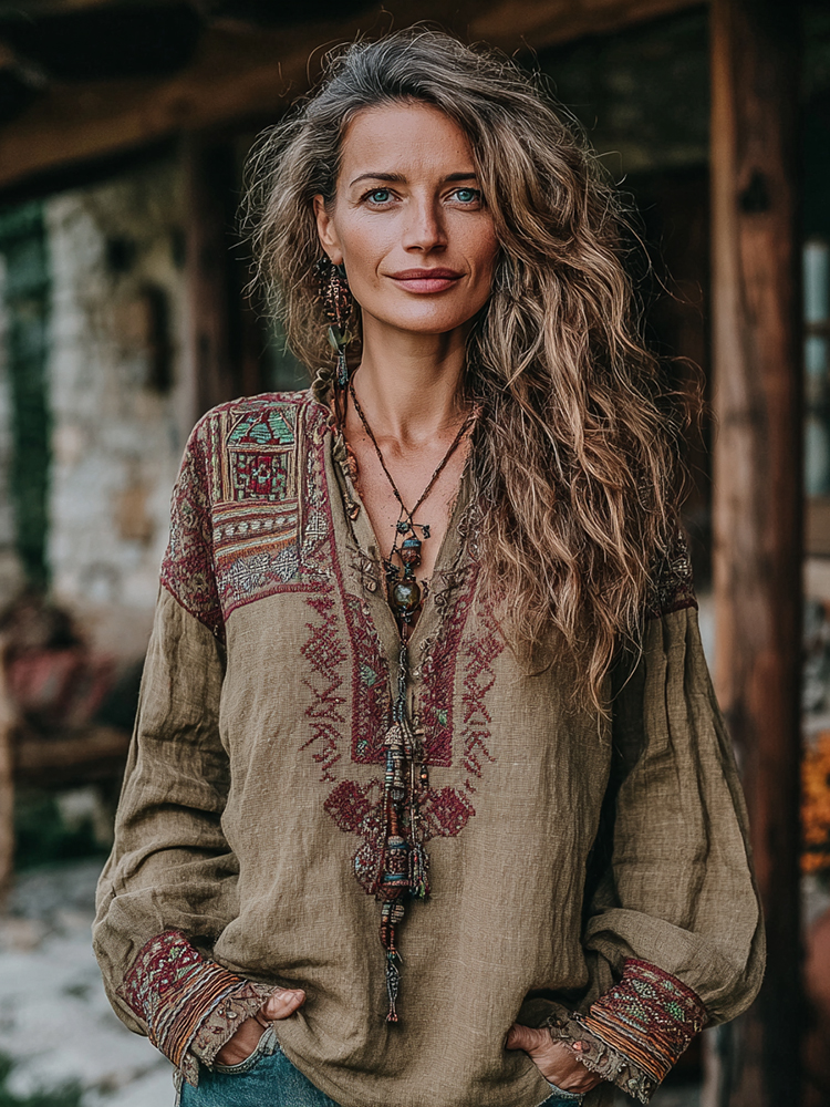 Women's Vintage Vacation Boho Tribal Ethnic Print V-neck Linen Blend Tops