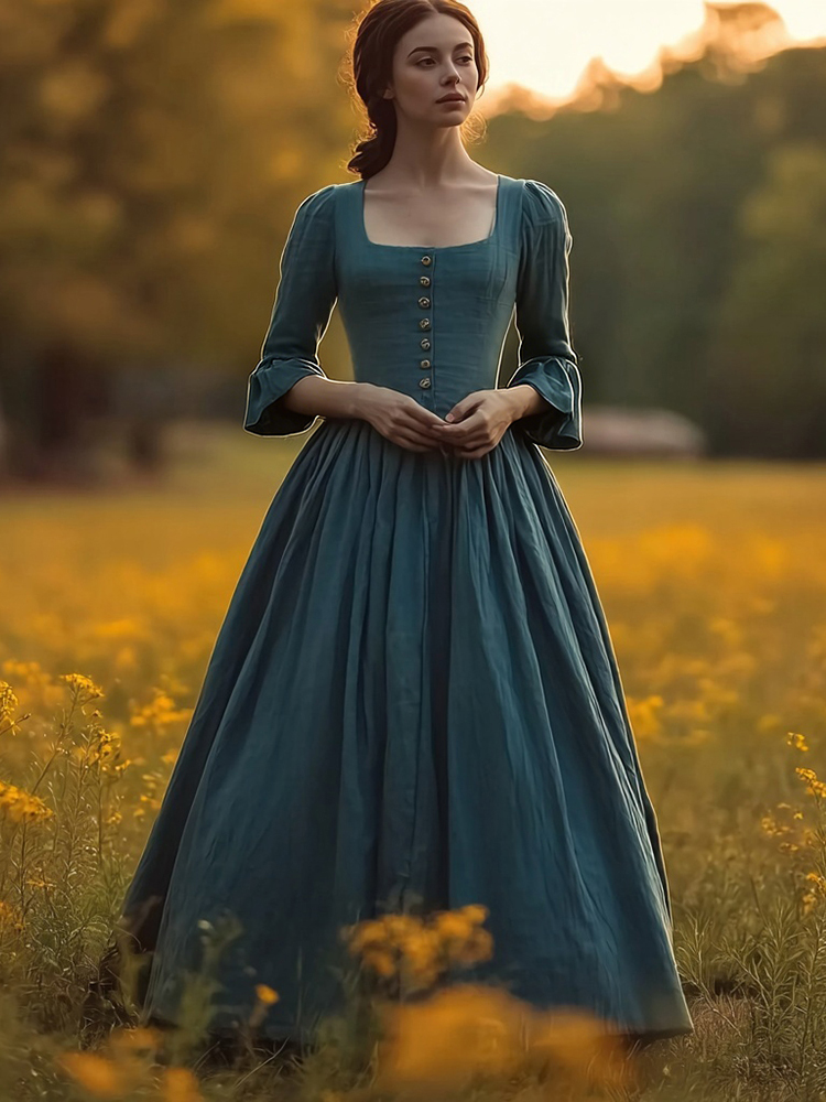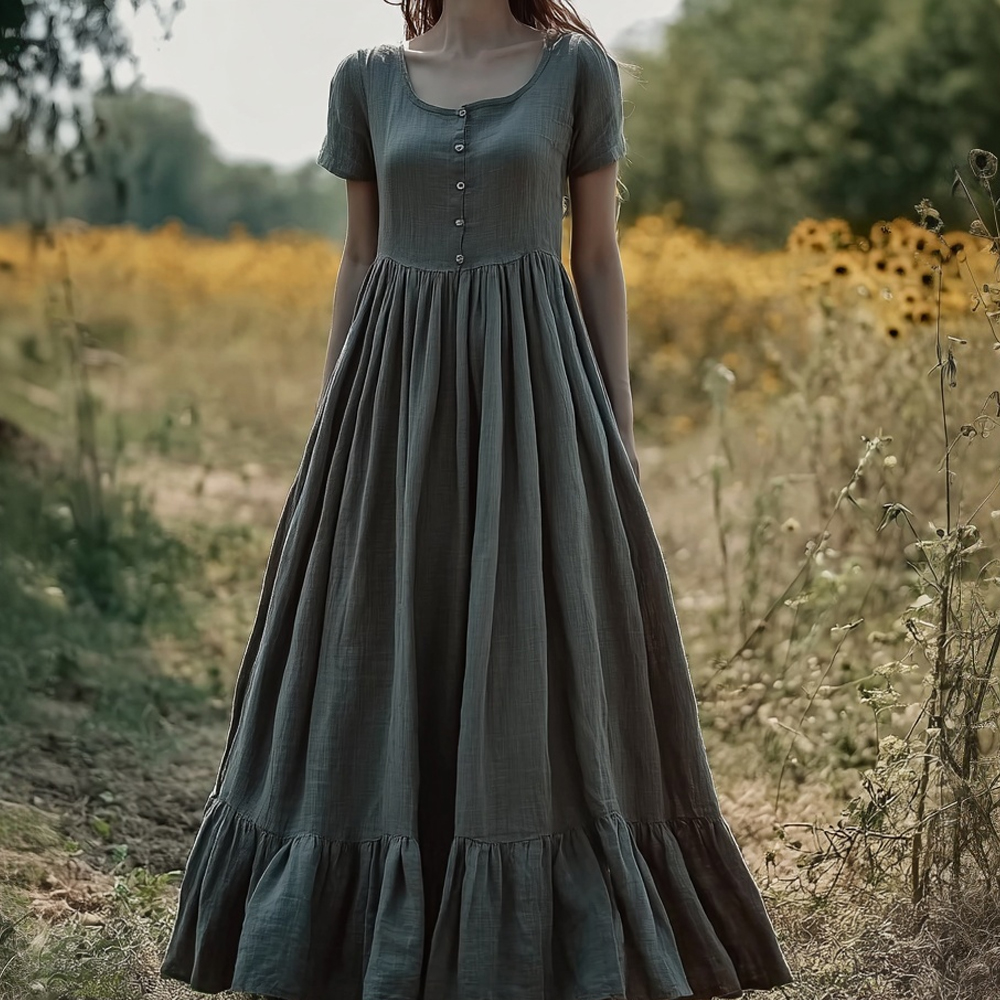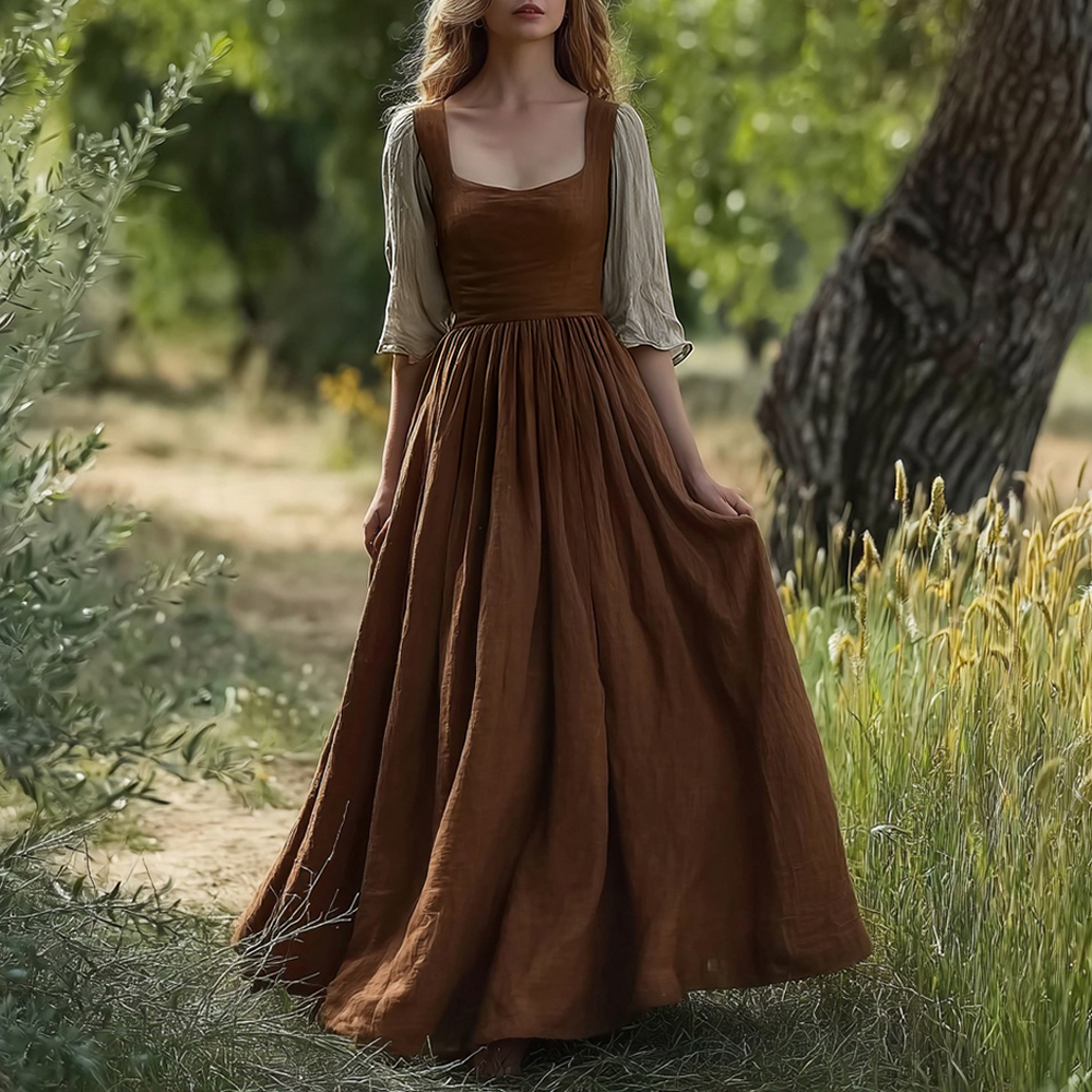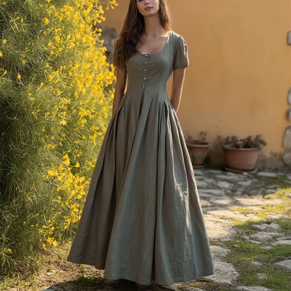Vintage Elegant Square Collar Flowy Linen Maxi Dress