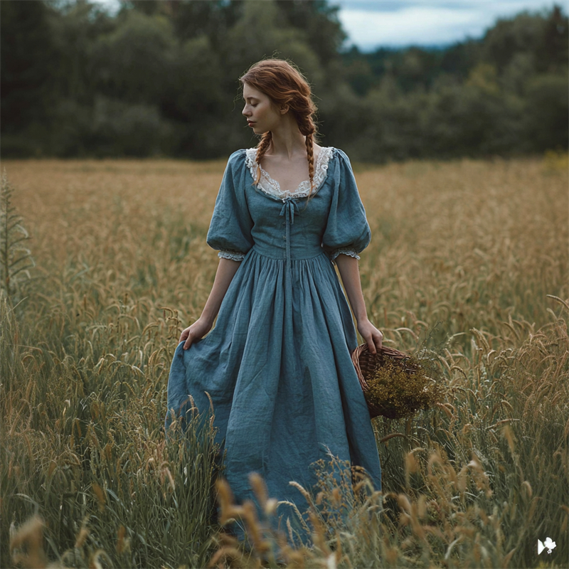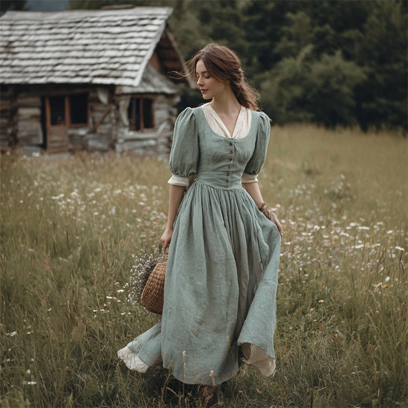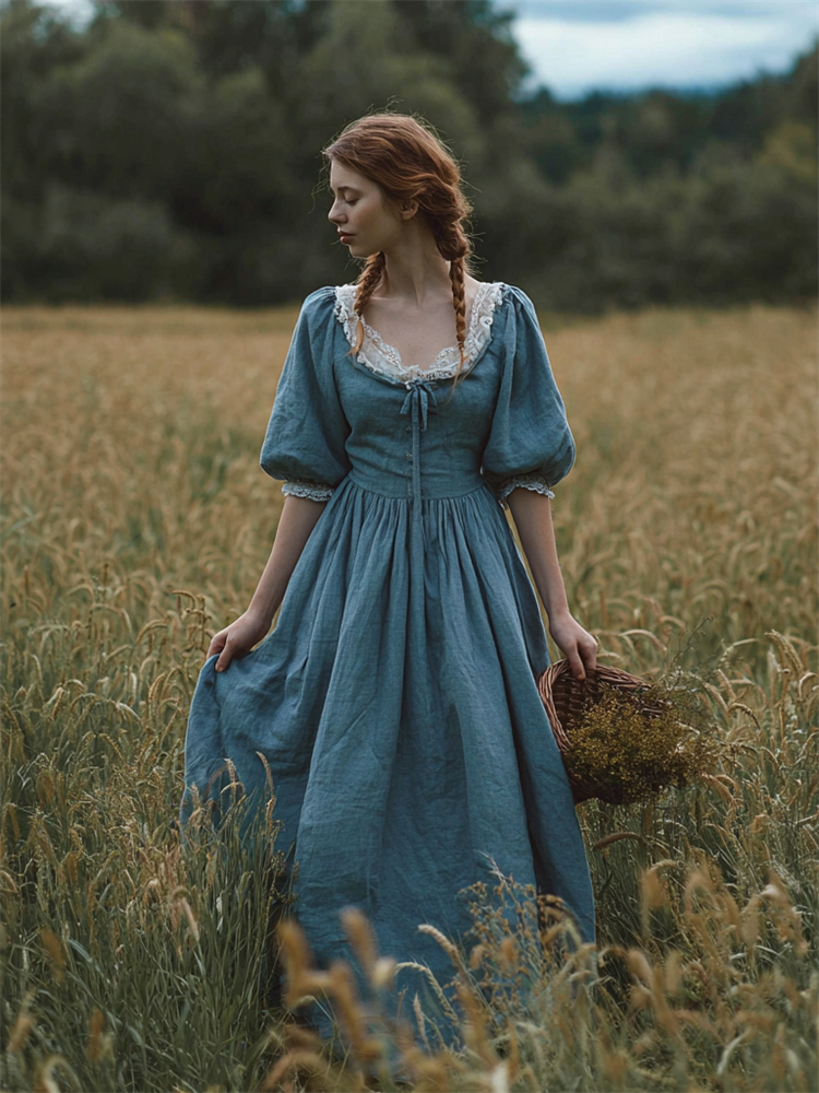 Vintage Cottagecore Puff Sleeve Flowy Linen Maxi Dress