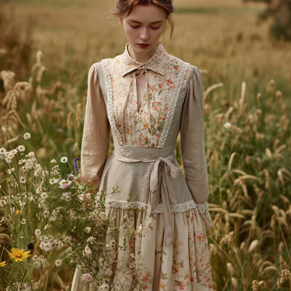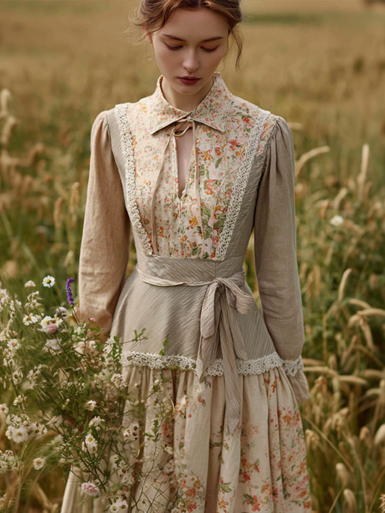 Retro Linen Lace Patchwork French Countryside Style Waist-cinching Dress
