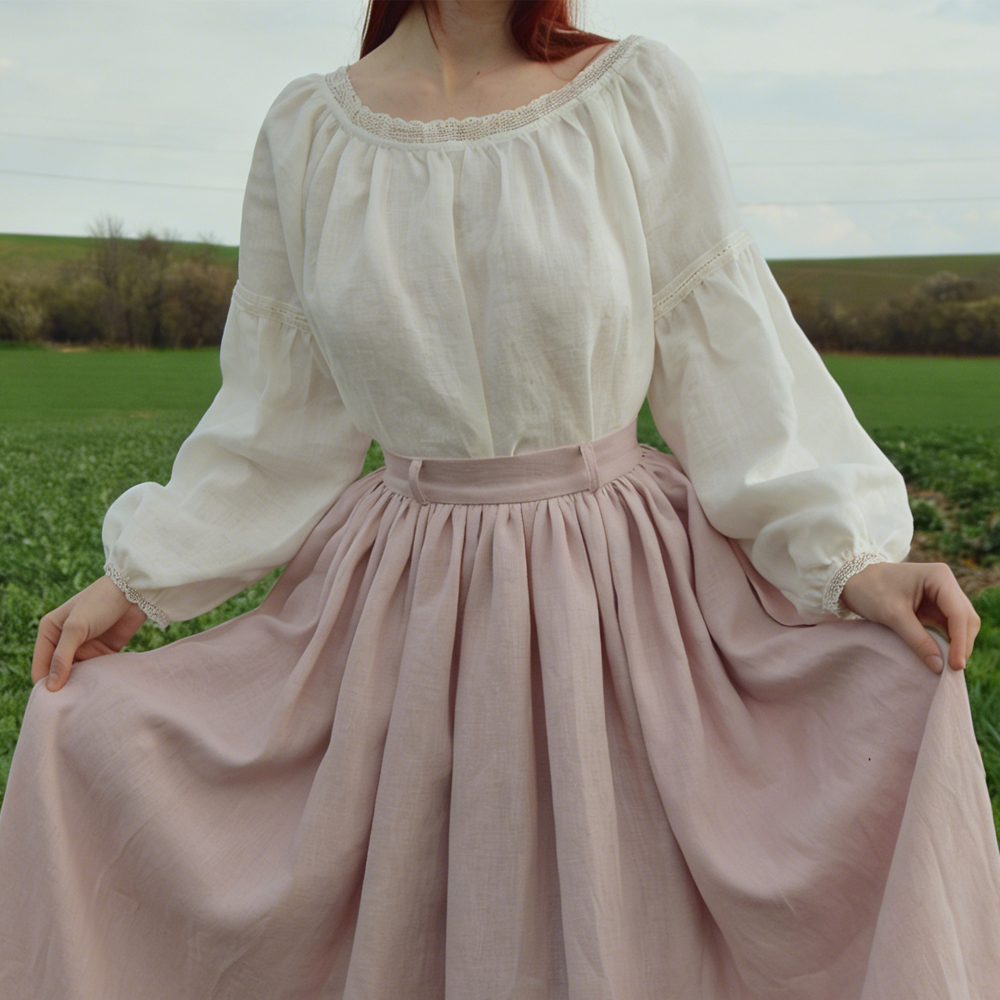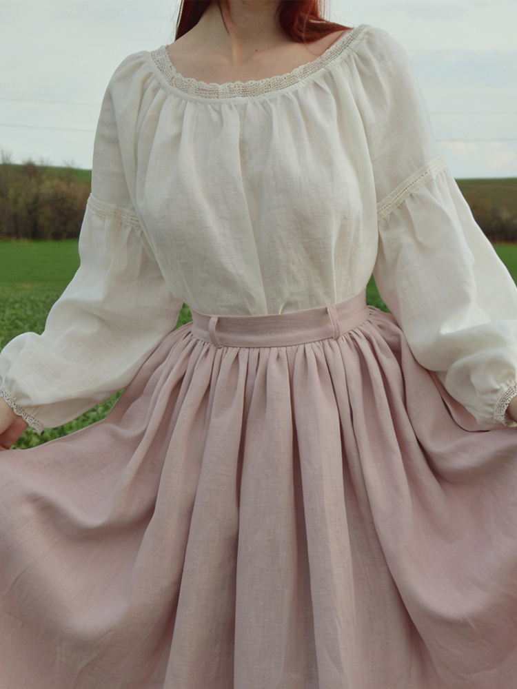 Vintage Lace Trim Round Neck Pullover Linen Shirt