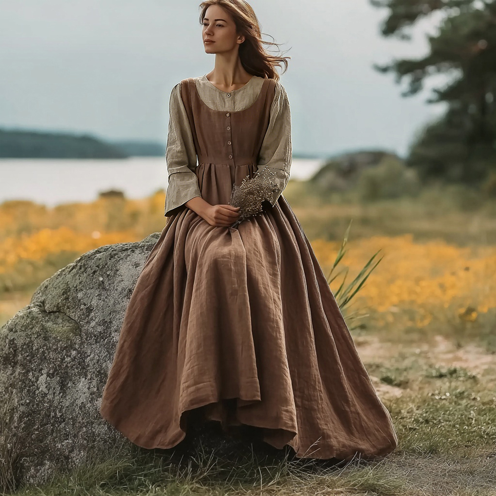 Retro Long Sleeve Skirt Linen Maxi Dress