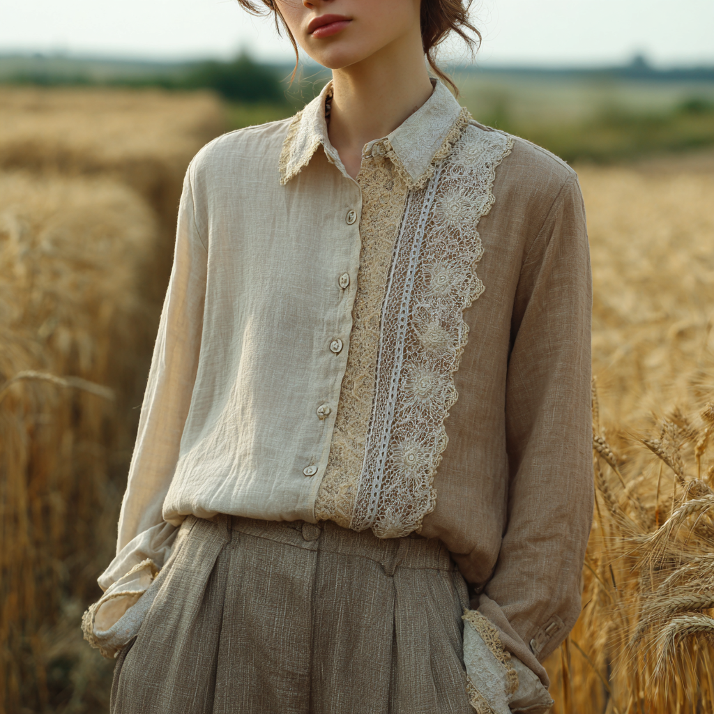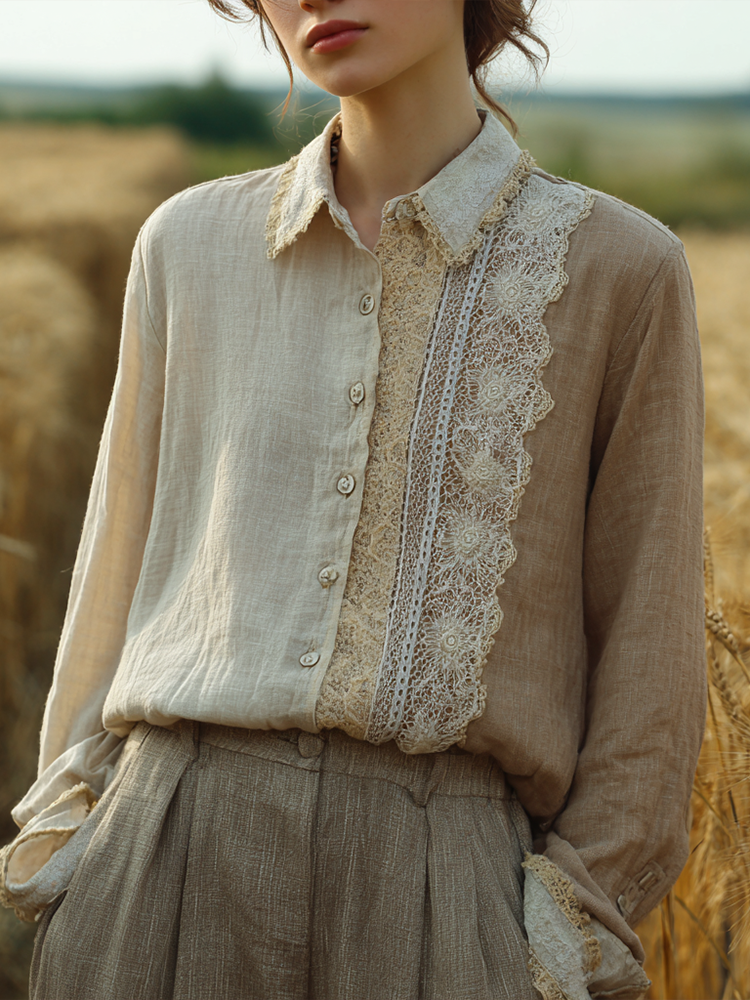 Retro Casual Lace Patchwork Design Linen Shirt