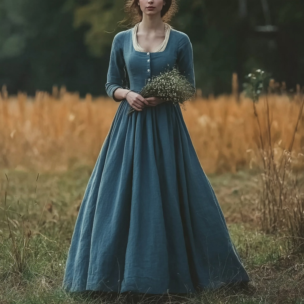 Retro Classy Square Collar Linen Maxi Dress