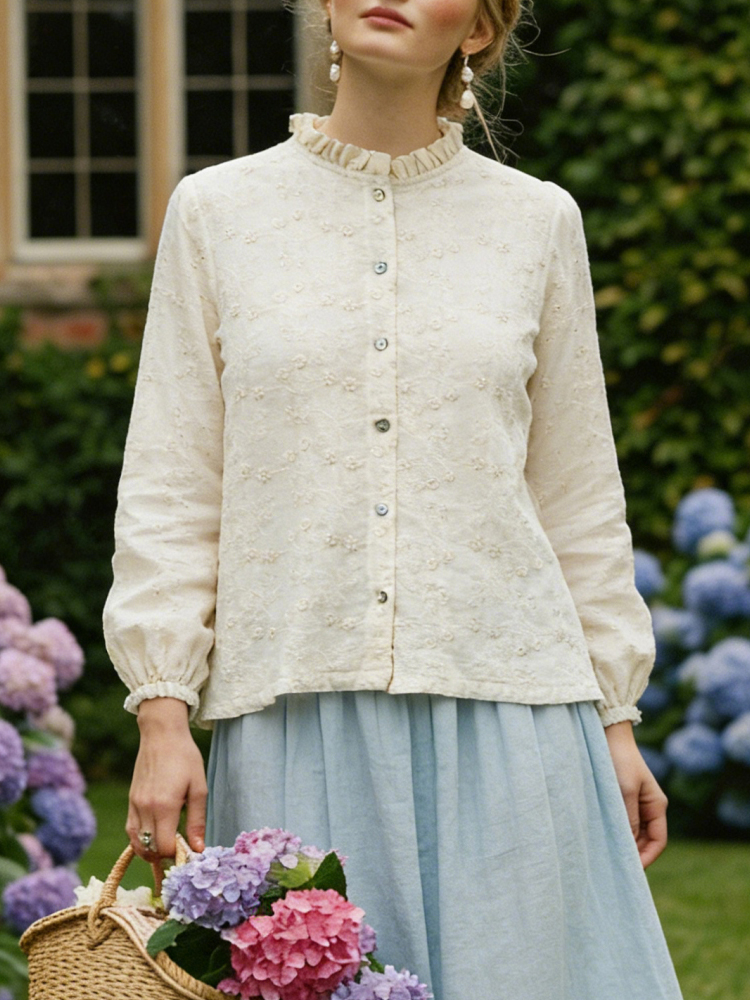 Vintage Embroidered Ruffled Collar Linen Shirt