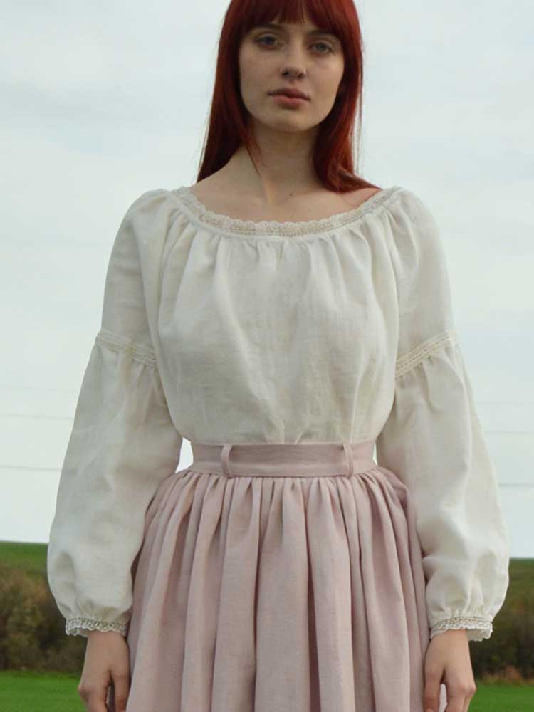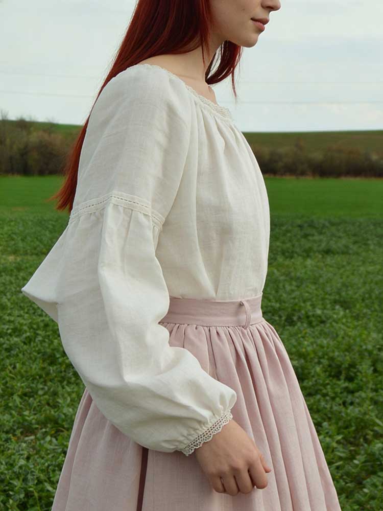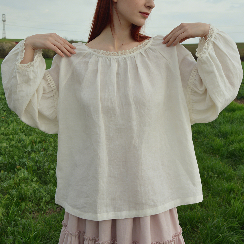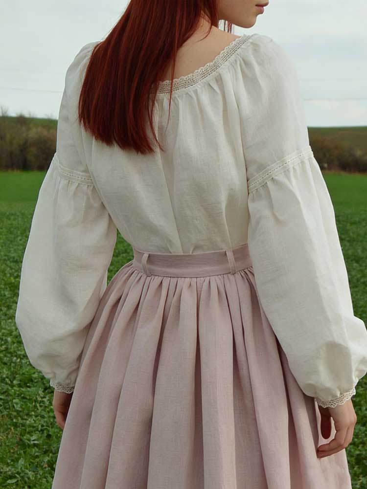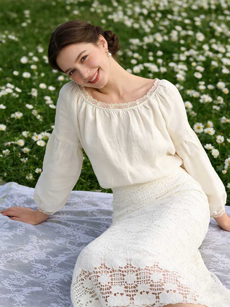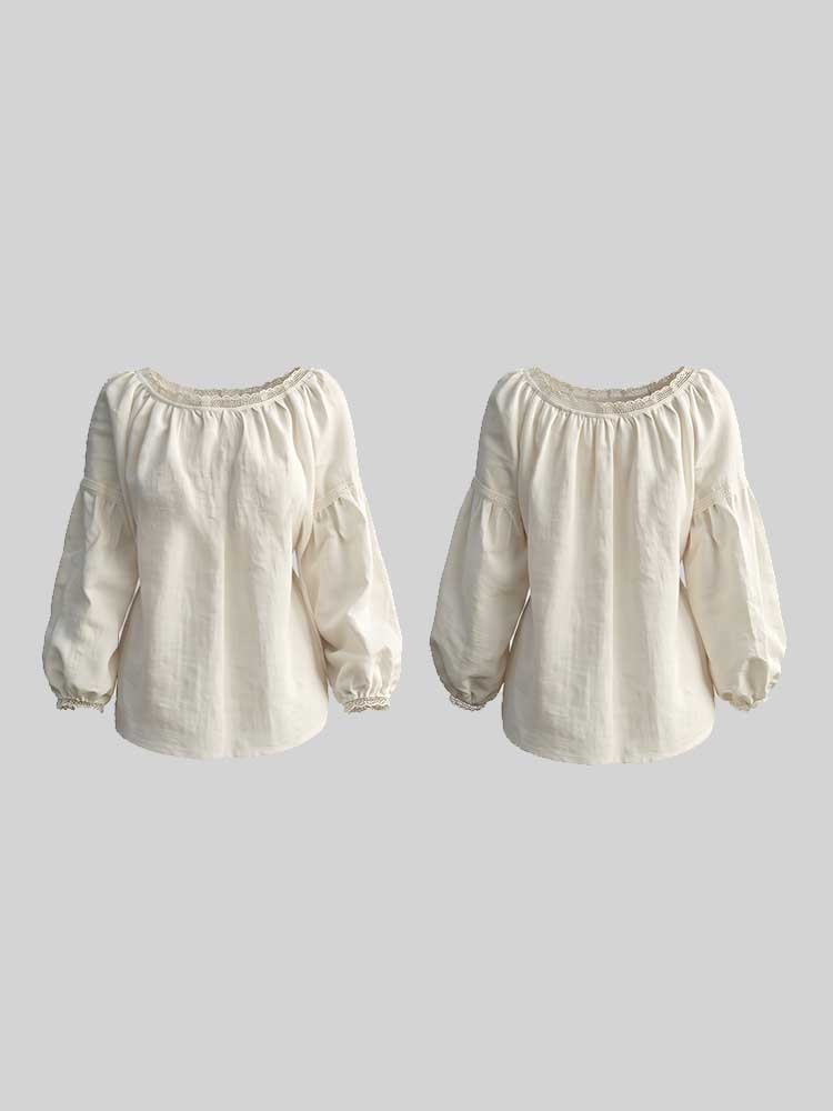 Vintage Lace Trim Round Neck Pullover Linen Shirt